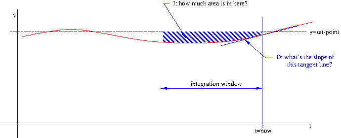 The red curve is the value of a control variable. At a given instant in time (now), the I and D are the area between the graph and the set-point and the slope of the tangent line, respectively.